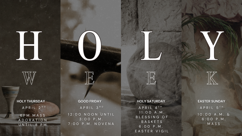 Last Friday in Lent, join us at 6:00 p.m. on Friday March 27th, 2026 for Mass followed by our last Stations of the Cross of Lent 2026. Walk with us and our children as the lead our walk with Jesus!